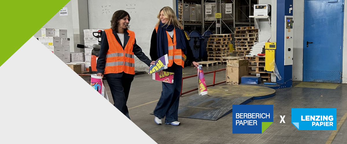 Gemeinsam mit unserem Partner Lenzing Papier haben wir uns für die bevorstehende Grillsaison etwas ganz Besonderes überlegt – Unsere Kollegin Britta Ketzler und Silvia Wiener, Business Development Managerin bei Lenzing Papier haben sich auf den Weg in unsere Lager begeben und einige Paletten mit unserem Recyclingpapier VIVUS 89 mit Plakaten bestückt.
